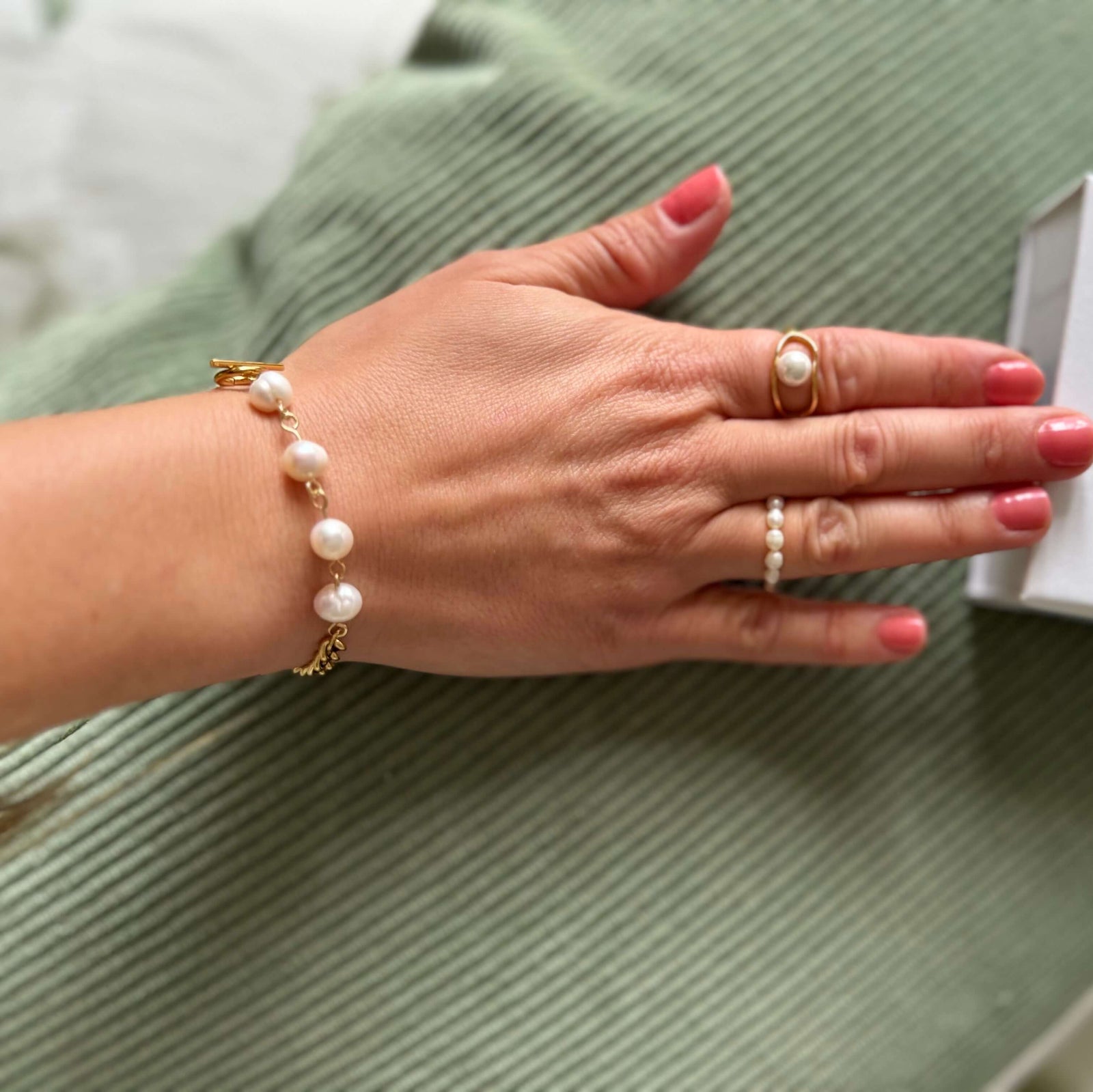 A perfect mix of elegance and edge—this bracelet combines classic freshwater pearls with a bold gold chain. The easy toggle clasp makes it effortless to wear, whether you're dressing up for dinner or keeping it casual with a white tee and jeans. A timeless piece for everyday layering or a standout on its own.
